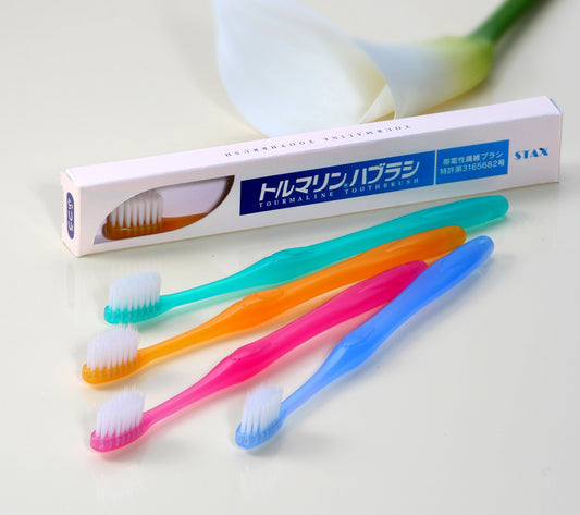 歯ブラシのブラシ部分にトルマリンの微粉末と水晶の微粉末を練り込んで仕上げた、なんとも贅沢なハブラシです。歯はもちろんのこと、歯ぐきをマッサージする感覚でお使いいただくと、よりこのハブラシの良さを実感していただけるはず。 毛の硬さも、あえて『ふつう』タイプのみをご用意させていただいたのは、「磨く」というよりも「マッサージ」していただく感覚でお使いいただくため。もちろん、歯周ポケットや歯の隙間の汚れまでしっかり落としてくれる先端毛ブラシと通常ブラシの二段階で植毛されており、また奥まで届きやすくヘッド部分はコンパクトな設計になっています。 柄の部分は、様々な角度から握りやすく、ほどよい弾力をもたせてあるので、歯や歯ぐきをやさしくサポートしてくれます。トルマリン入り歯磨き粉『T・Pデンタル』とあわせてお使い下さい! 歯ブラシは「ピンク」「ブルー」「グリーン」「オレンジ」の4色から選べます。 【毛の硬さ】ふつう【耐熱温度】 80度【特許番号】第3165682号 ※帯電性繊維専用の紙箱に入れてお届けします 【10本以上のご注文で送料無料】 例) ピンク2本, オレンジ4本, グリーン3本, ブルー1本通常価格 ¥418 (Tax in)通常価格単価 / あたり