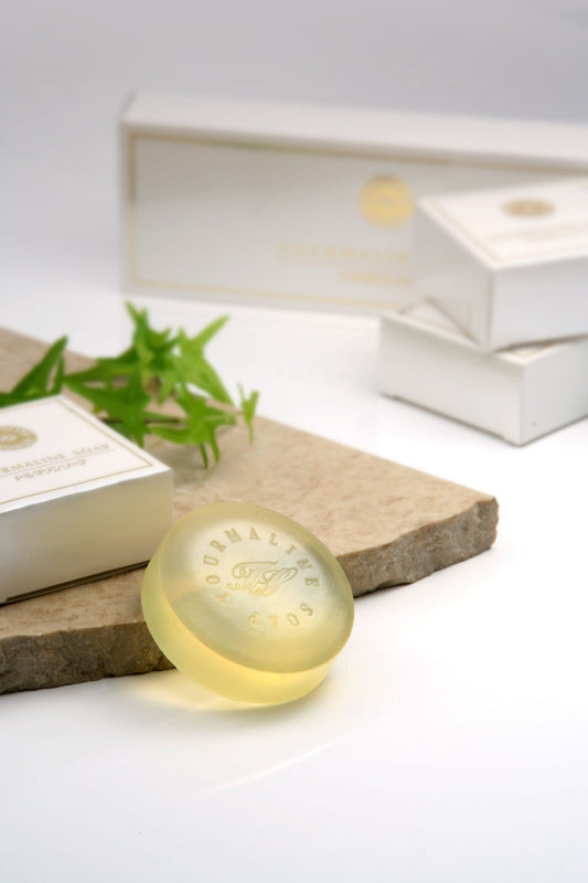 60~90日間熟成・自然乾燥。ひとつひとつ丹念に手で磨きをかけて仕上げた無添加の肌にやさしい石鹸です。防腐剤・着色料・香料は使用しておりません。 シソエキス、モモ葉エキス(以上保湿剤)を配合し、ラウリン酸をカットした低刺激石鹸です。このラウリン酸がないと泡立ちが悪くなり又汚れを落とす力が弱くなりますが、皮膚に対し刺激が強いことが欠点です。「トルマリンソープ」はラウリン酸を取り除き、なおかつ泡立ちと洗浄力のある石鹸に仕上げました。素材となるベースを型(わく)に流し込み、60~90日間熟成・自然乾燥させ、ひとつひとつ丹念に手で磨きをかけて仕上げた「わくねり石鹸(透明石鹸)」です。防腐剤・着色料・香料は使用していておりません。(小麦胚芽抽出エキス等、小麦成分は一切使用しておりません) 《医薬部外品》通常価格 ¥2,200 (Tax in)通常価格単価 / あたり
